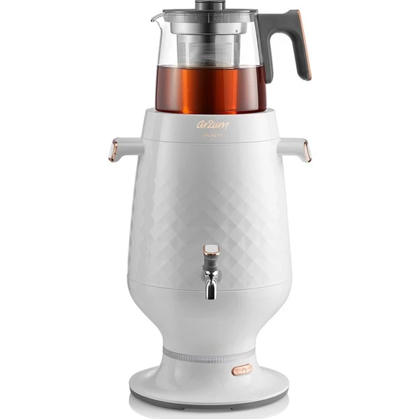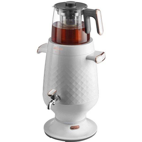 Mit dem elektrischen Samowar AR3083 lässt sich ganz einfach Tee zubereiten. Die Doppelwärmetechnologie bringt mit einer Leistung von 2200 Watt bis zu 3.5 l Wasser zum Kochen. Die Glaskanne fasst 1,2 Liter und eignet sich dank dem Edelstahl-Teefilter auch für losen Tee. Die Bedienung erfolgt über einen Ein-/Ausschalter und während des Kochvorgangs ertönt ein Signalton und die Kontrollleuchte leuchtet. Ist das Wasser warm, schaltet sich die Warmhaltefunktion ein. Eine Tropfschale verhindert Wasserflecken.