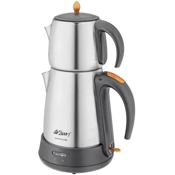 Mit dem elektrischen Teebereiter AR 3004 lässt sich ganz einfach Tee zubereiten. Das Doppelheizsystem bringt mit einer Leistung von 1650 Watt das Wasser zum Kochen und hält es mit 165 Watt warm. Der Edelstahl-Kessel fasst 1,8 Liter und kann, mit seinem speziellen Deckel, auch nur als Wasserkocher verwendet werden. Die Edelstahl-Teekanne hat ein Fassungsvermögen von 0,7 Litern. Die Verwendung ist kabellos und das verdeckte Heizelement erleichtert die Reinigung.