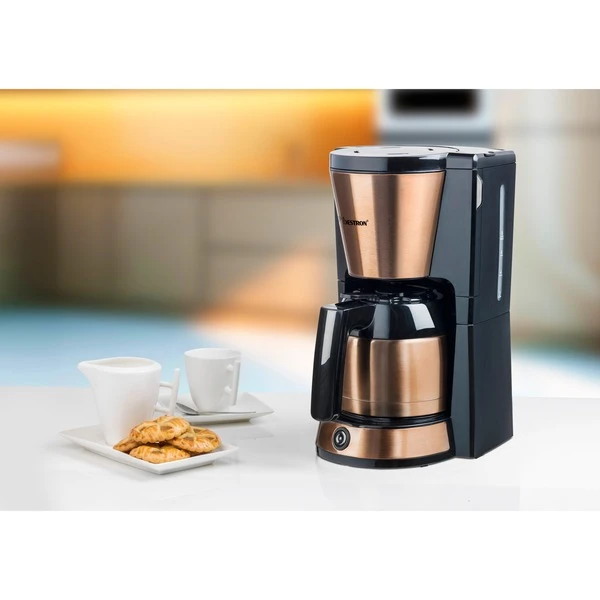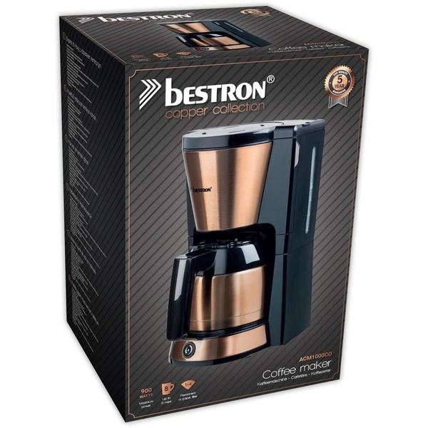 Die Bestron ACM1000CO ist eine klassische Filterkaffeemaschine mit doppelwandiger Thermokanne im stilvollen Kupfer-Design. Die Thermokanne fasst bis zu 8 Tassen Kaffee. Der entnehmbare Filterhalter mit mitgeliefertem Permanentfilter kann bei Bedarf auch mit Papierfiltern genutzt werden. Zu den weiteren praktischen Features gehören der Tropfverschluss, der Überhitzungsschutz und die Wasserstandsanzeige mit Tassenskala. Und dank integrierter Abschaltautomatik schaltet sich die Bestron ACM1000CO für mehr Sicherheit und einen geringeren Energieverbrauch von selbst ab.Art.-Nr.: 1697342