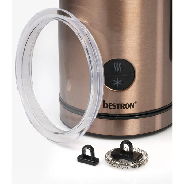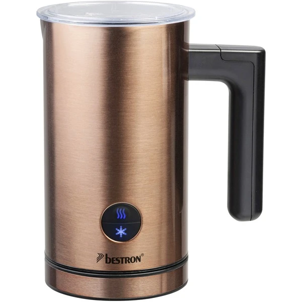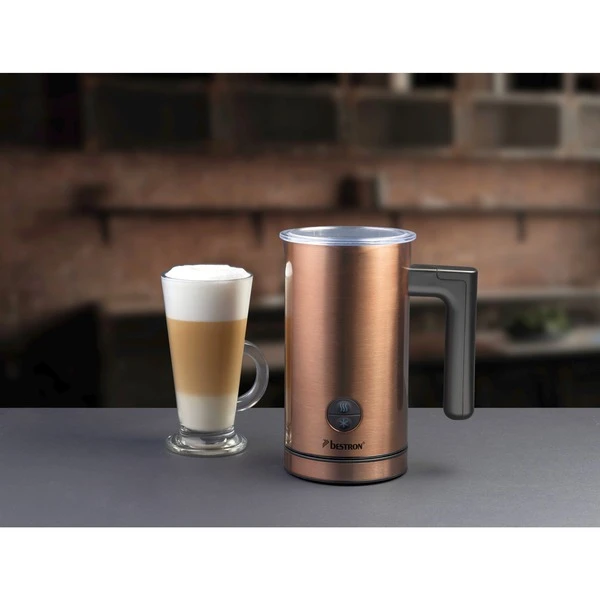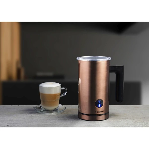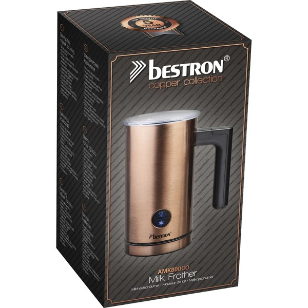 Der AMK1000CO Milchaufschäumer aus der Copper Collection von Bestron hat ein stylisches Kupferdesign und bereitet innerhalb von 2 Minuten Milchschaum für einen leckeren Cappuccino, Café Latte oder Macchiato zu. Mit diesem Milchaufschäumer können 150 ml Milch aufgeschäumt und 300 ml Milch auf 65°C erhitzt werden (auch für Pflanzenmilch wie Mandelmilch oder Sojamilch geeignet). Der AMK1000CO verfügt über einen Ein-/Ausschalter mit Kontrollleuchte, einen abnehmbaren Rührer und Quirl, einen transparenten Deckel und ist dank Antihaftbeschichtung hygienisch und leicht zu reinigen. Auch die Abschaltautomatik und der Überhitzungsschutz machen den AMK1000CO sicher im Gebrauch.Art.-Nr.: 1740928