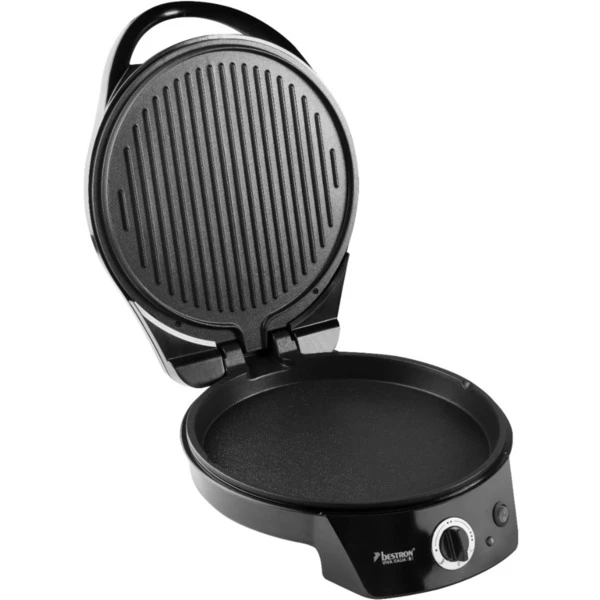 Der Pizzaofen von Bestron ist ideal für die Zubereitung von leckeren tiefgekühlten oder frischen Pizzen (Ø 27cm) innerhalb von nur ca.10 Minuten. Dank 1800 Watt heizt der Ofen innerhalb von sieben Minuten auf. Er eignet sich nicht nur für Pizza sondern auch für türkische Pizza, Flammkuchen, Quiche oder zum Aufwärmen. Aufgeklappt und durch die beiden Heizelemente entsteht ein großflächiger Tischgrill. Die Antihaftbeschichtung erleichtert die Reinigung. Die Bedienung ist ein Kinderspiel, die Temperatur kann stufenlos bis 230° C eingestellt werden und eine grüne Lampe leuchtet auf, wenn das Gerät einsatzbereit ist. Mit Antihaftbeschichtung zum leichten Entnehmen der Speisen und zur einfachen Reinigung. Der Griff ist wärmeisoliert und die Antirutschfüße sorgen für einen sicheren Stand. Art.-Nr.: 1875377