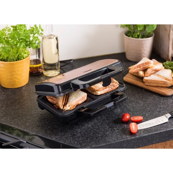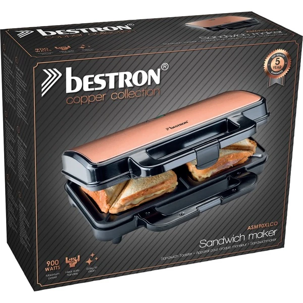 Der Sandwichmaker ASM90XLCO aus der Copper Collection in stilvollen Kupfer-Design macht das Zubereiten von leckeren Sandwiches zum Kinderspiel. Mit einer Leistung von 900 Watt und automatischer Temperaturregelung lassen sich einfach 4 dreieckige Sandwiches zubereiten. Die Bereitschaftsanzeige signalisiert das Erreichen der passenden Backtemperatur. Für einen sicheren Gebrauch sorgen das wärmeisolierende Gehäuse mit großem wärmeisoliertem Griff mit Verriegelungsclip und die Antirutschfüße. Die antihaftbeschichteten Sandwichplatten erleichtern die Reinigung. Der ASM90XLCO kann platzsparend senkrecht aufbewahrt werden.