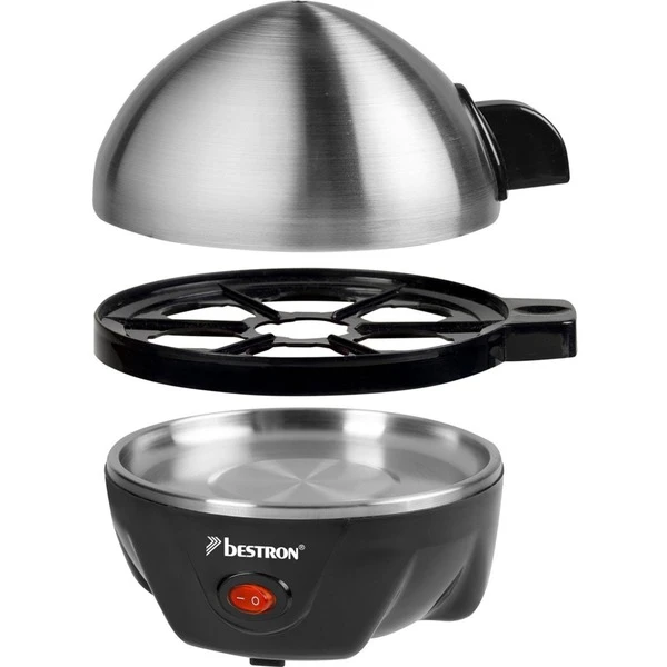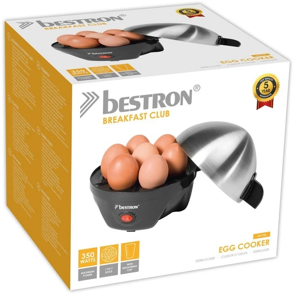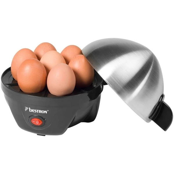 Mit dem Bestron Eierkocher AEC700 kocht man bis zu sieben Eier auf einmal. Mit dem beiliegenden Meßbecher kaltes Wasser, je nach dem gewünschten Härtegrad, abmessen, die Eier in den Einsatz stellen und abdecken. Wenn die Eier fertig sind ertönt ein akustisches Signal. Der praktische Ei-Halter lässt sich zum Abschrecken herausnehmen. Durch das Perforieren der Eierschale praktischen Eierstecher vermeidet man geplatzte Eier. Der hitzebeständige Edelstahldeckel macht den Eierkocher AEC700 auch optisch zu einem Blickfang. Auch die Reinigung des Eierkochers ist sehr einfach, da alle Einzelteile spülmaschinengeeignet sind.Art.-Nr.: 1636597