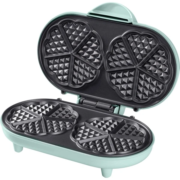 Mit dem Doppelwaffeleisen ADWM1000M von Bestron lassen sich zwei fünfteilige herzförmige Waffeln gleichzeitig zaubern. Das Gehäuse in frischem Mint ist hoch hitzebeständig und die Antirutschfüße sorgen für einen sicheren Gebrauch. Das Waffeleisen ist innerhalb weniger Minuten einsatzbereit und die Bedienung ist dank der automatischen Temperaturregelung und der Bereitschaftsanzeige ein Kinderspiel. Die Antihaftbeschichtung sorgt für leichtes Entnehmen der Waffeln sowie für eine einfache Reinigung.Art.-Nr.: 1820274
