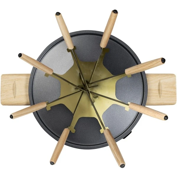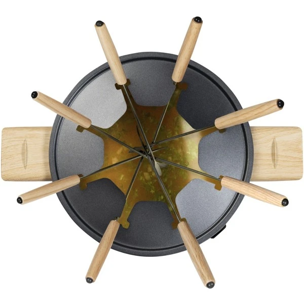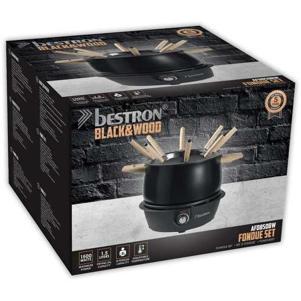 Das Bestron Fondue AFD850BW aus Black & Wood Serie hat einen abnehmbaren 1,5 l Topf mit wärmeisolierten Griffen. Dank einer Leistung von 1500 Watt ist das Fondue Set schnell einsatzbereit. Der Spritzschutz mit Gabel-Halter vermeidet unnötige Spritzer und bringt Ordnung in den Fonduetopf. Das Fondue AFD850BW ist für acht Personen geeignet und im Lieferumfang sind acht Fonduegabeln enthalten. Mit dem regelbaren Thermostat lässt sich die optimale Gartemperatur einstellen. Zur einfachen Reinigung ist der Topf spülmaschinengeeignet.