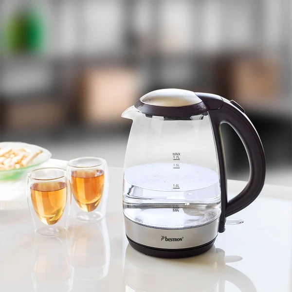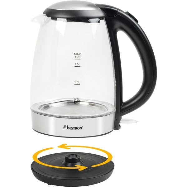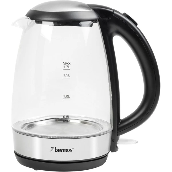 Der Glaswasserkocher AWK780G von Bestron im stilvollen Design mit blauer LED-Beleuchtung fasst bis zu 1,7 Liter Wasser und bringt es mit einer Leistung von 2200 Watt schnell zum Kochen. Für Komfort sorgen die 360°C-Basis, ein engmaschiger, herausnehmbarer Kalkfilter und die einfache Bedienung. Der Wasserbehälter aus hitzebeständigem Sicherheitsglas ist mit einer Wasserstandsanzeige ausgestattet. Dank integrierter Kochstoppautomatik, Trockengehschutz und Deckel mit Sicherheitsverschluss ist der Wasserkocher AWK780G auch in Bezug auf Sicherheit eine gute Wahl. Das verdeckte Heizelement schützt vor Kalkablagerungen und erleichtert die Reinigung. Für sicheren Stand sorgen die Antirutschfüße. Art.-Nr.: 1636601