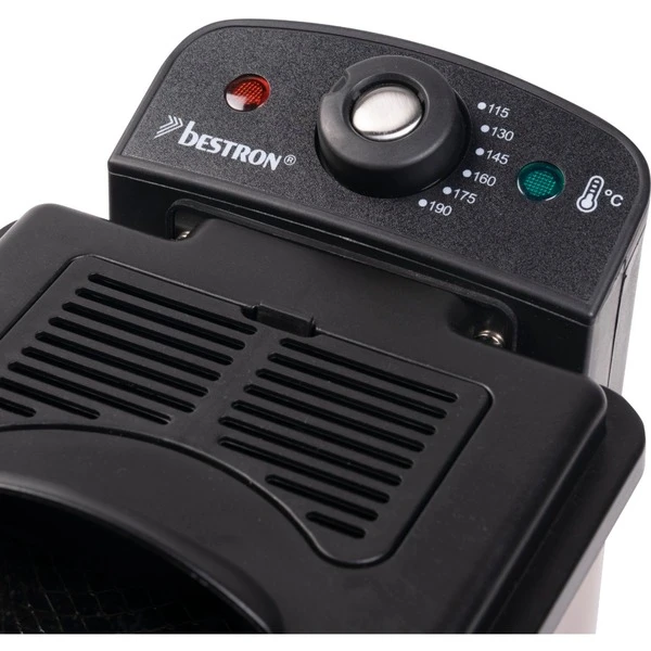 Die Bestron Mini Fritteuse AF100CO mit Kaltzonen-Technik aus der Serie Copper Collection ist in stilvollem Kupfer-Design gehalten. Das Frittierfett ist wegen Kaltzonen-Technik länger haltbar, denn herabsinkende Frittierreste verbrennen nicht am Boden. Sie eignet sich ideal zum Frittieren von Pommes Frites, Snacks, Fisch und vielem mehr. Der herausnehmbare emaillierter Behälter fasst ca. 1,5 Liter Öl und reicht für ca. 150 Gramm Pommes Frites aus. Die Temperatur lässt sich bis 190ºC regeln. Der doppelt isolierte Spritzschutzdeckel mit Sichtfenster und auswechselbarem Fettfilter hält die Arbeitsplatte sauber. Die Bestron Mini Fritteuse AF100CO ist vollständig auseinandernehmbar, alle Teile außer dem Heizelement sind spülmaschinengeeignet. Sie ist außerdem mit einer Ein/Aus-Kontrollleuchte, einer Temperatur-Kontrollleuchte, Überhitzungsschutz, wärmeisolierten Griffen und Antirutschfüßen ausgestattet.Art.-Nr.: 1915095