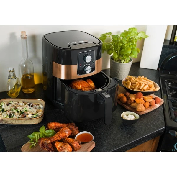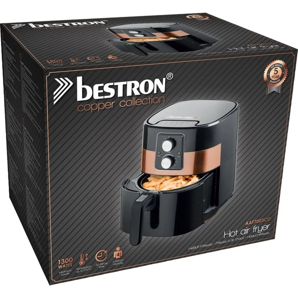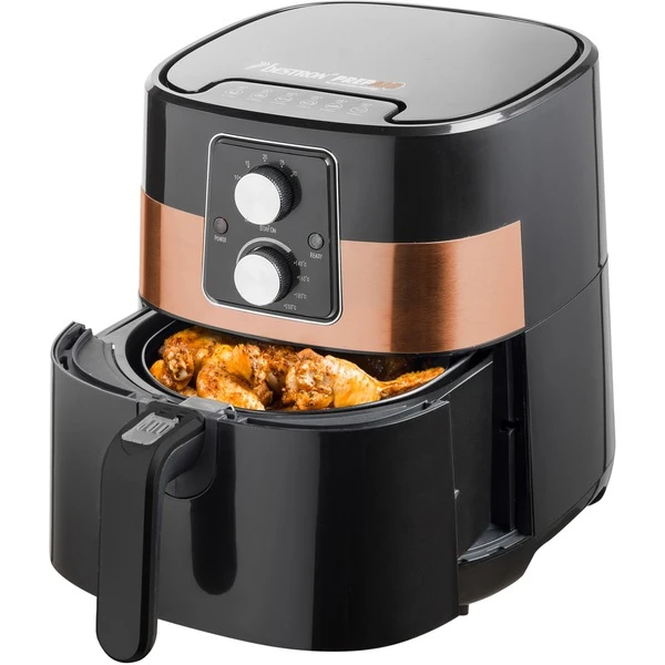 Mit der PrepAir AAF7003CO Heißluftfritteuse aus der Copper Collection in stielvollem Kuper-Design kann man gesünder und sicherer Frittieren, Backen, Braten und Grillen, ohne Öl und ohne Fett. Durch die große Kapazität von ca. 4 Litern können bis zu 1000 Gramm Pommes Frites oder 8 Snacks gleichzeitig zubereitet werden. Die PrepAir eignet sich nicht nur für Pommes Frites und Snacks sowie Kartoffelprodukte sondern auch Fleisch, Fisch, Gemüse, Brot usw. Die einzigartige PrepAir-Technologie sorgt für gleichmäßiges Garen durch die schnelle Zirkulation der Luft. Die Bedienung ist intuitiv und komfortabel, man stellt einfach Temperatur und Zeit ein und es kann losgehen! Bis 200°C kann die Temperatur stufenlos eingestellt werden. Nach Ablauf des 30-Minuten-Timer ertönt ein Signal und das Gerät schaltet sich automatisch ab. Diese Art der Speisezubereitung ist nicht nur fettarm sondern es entstehen keine unangenehmen Gerüche. Die PrepAir AAF7003CO lässt sich nach dem Gebrauch sehr einfach reinigen, da Behälter und Frittierkorb antihaftbeschichtet und spülmaschinenfest sind. Für Sicherheit sorgen die Kontrollleuchten, der Überhitzungsschutz und die rutschfesten Füße. Art.-Nr.: 1742301