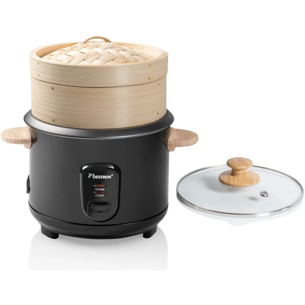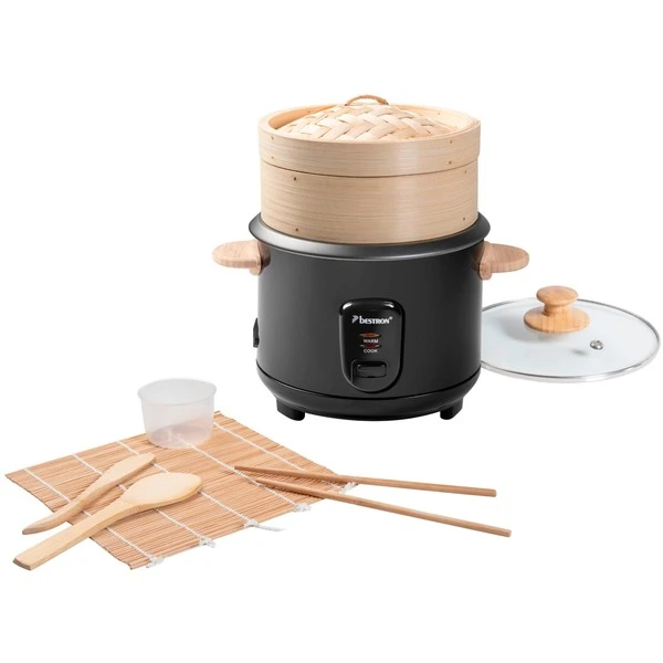 Der Bestron ARC100BBS ist ein vollautomatischer Reiskocher für vier bis sechs Personen. Er kocht schnell und vollautomatisch alle Sorten Reis wie Natur-, Basmati-, Risotto-, Wild-, Sushi-Reis und mehr. Mit dem extra Bambus Dampfkorb (Ø 19cm) lassen sich Teigtaschen, Gemüse, Fisch oder Fleisch schonend garen. Das fünfteilige Sushi-Maker-Set enthält zwei Stäbchen, eine Bambus-Rolle, einen kleinen und einen großen Löffel sowie einen Messbecher. Der ARC100BBS hat eine maximale Kapazität von 750g Reis, das entspricht ca. 5 Tassen. Die Warmhaltefunktion hält den Reis für längere Zeit auf der perfekten Temperatur. Für Sicherheit sorgen zwei Kontrollleuchten zum Kochen und zum Warmhalten. Die Bedienung ist sehr einfach und die automatische Abschaltung macht die Nutzung noch bequemer. Durch den Glasdeckel mit Dampfaustrittsöffnung hat man den Garvorgang immer im Blick. Die Innenwanne ist antihaftbeschichtet und verfügt über eine Wasserstandanzeige. Zur einfacheren Reinigung ist die herausnehmbare Innenwanne spülmaschinengeeignet.