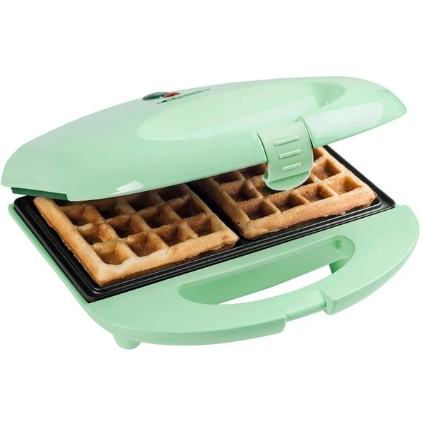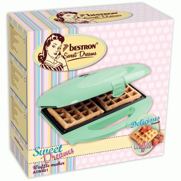 Mit dem Waffeleisen ASW401 von Bestron lassen sich zwei herrliche Brüsseler Waffeln zaubern. Das Gehäuse in frischem Hellgrün ist hoch hitzebeständig und die Griffe sind wärmeisoliert. Für noch mehr Sicherheit sorgen die Antirutschfüße. Die Reinigung ist dank der Antihaftbeschichtung ein Kinderspiel. Art.-Nr.: 1435857