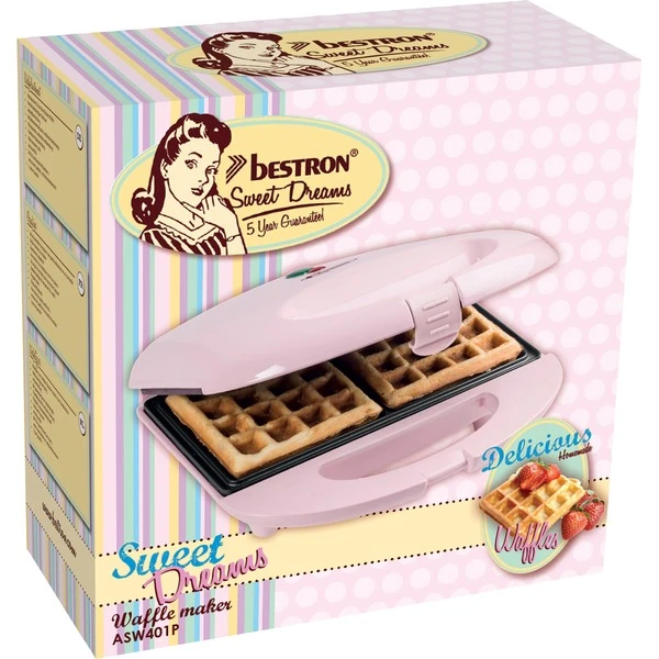 Mit dem Waffeleisen ASW401P von Bestron lassen sich zwei herrliche Brüsseler Waffeln zaubern. Das Gehäuse in zartem Rosa ist hoch hitzebeständig und die Griffe sind wärmeisoliert. Für noch mehr Sicherheit sorgen die Antirutschfüße. Die Reinigung ist dank der Antihaftbeschichtung ein Kinderspiel. Art.-Nr.: 1636576