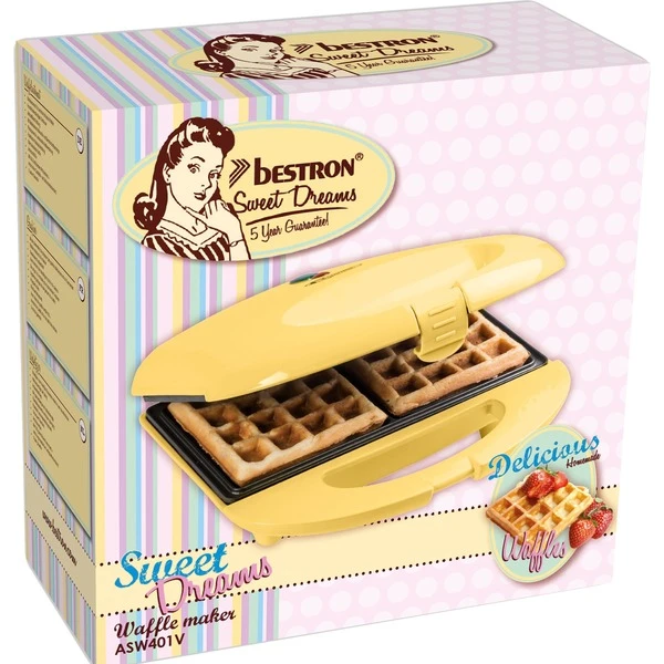 Mit dem Waffeleisen ASW401 von Bestron lassen sich zwei herrliche Brüsseler Waffeln zaubern. Das Gehäuse in zartem Gelb ist hoch hitzebeständig und die Griffe sind wärmeisoliert. Für noch mehr Sicherheit sorgen die Antirutschfüße. Die Reinigung ist dank der Antihaftbeschichtung ein Kinderspiel. Art.-Nr.: 1820272
