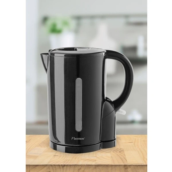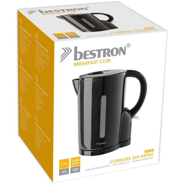 Der Wasserkocher AWK1101Z von Bestron fasst bis zu 1,7 Liter Wasser und bringt es mit einer Leistung von 1850 bis zu 2200 Watt zum Kochen. Die Bedienung ist sehr einfach und die Wasserstandsanzeige ermöglicht eine schnelle Überprüfung des Wasserstands. Dank integrierter Kochstoppautomatik, Trockengehschutz und Sicherheitsverriegelung ist der Wasserkocher AWK1101Z auch in Bezug auf Sicherheit eine gute Wahl. Das verdeckte Heizelement schützt vor Kalkablagerungen und erleichtert die Reinigung. Für sicheren Stand sorgen die Antirutschfüße. Art.-Nr.: 1435867