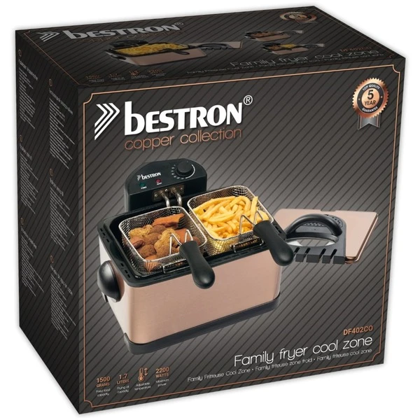 Die XL Fritteuse DF402CO von Bestron mit Kaltzonentechnologie im hochwertigen Kupfer-Design, erhitzt mit 2000 Watt im Handumdrehen das Frittierfett. Der herausnehmbare, emaillierter Fettbehälter fasst 4,5 l. Es gibt einen großen Frittierkorb und zwei kleine. Mit dem Großen können in einem Durchgang bis zu 1,5 kg Pommes oder bis zu 20 Frikadellen frittiert werden. Die kleinen Körbe fassen jeweils 750 g. Die Betriebstemperatur lässt sich stufenlos bis 190 Grad regeln. Im Deckel der XL Fritteuse befindet sich ein auswechselbarer Geruchsfilter sowie ein Sichtfenster. Anti-Rutsch-Füße und wärmeisolierte Handgriffe sorgen für einen sicheren Gebrauch und danach lässt sich das Gerät vollständig zerlegen und in der Spülmaschine reinigen – außer das Heizelement.