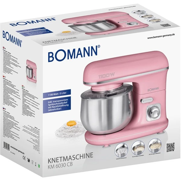 Die kraftvolle Knetmaschine KM 6030 mit leistungsstarken 1.100 Watt ist ideal für die Zubereitung von Rühr- und Knetteigen, auch lockerer Biskuit und luftiger Eischnee ist mit dem Edelstahl-Schneebesen ein Kinderspiel. In der großen 5-Liter-Edelstahlschüssel lassen sich, dank des robusten Spezialgetriebes, Teige bis zu 2,5 kg – 3 kg verarbeiten. Mit dem Alu-Druckguss-Rührhaken lassen sich größere Mengen Teig gleichmäßig verrühren. Für schwere Teige wie Hefe- oder Brotteig ist der Alu-Druckguss-Knethaken optimal geeignet. Die Geschwindigkeit kann stufenlos eingestellt werden. Ein abnehmbarer Spritzschutzdeckel mit Nachfüllöffnung, der um 35° schwenkbare Multifunktionsarm mit Entriegelungsmechanismus und das Schnellspannfutter zum Wechseln der einzelnen Werkzeuge sorgen bei der KM 6030 für weiteren Komfort. Für Sicherheit sorgen die Sicherheitsschaltung sowie die Saugfüße. Art.-Nr.: 1588214