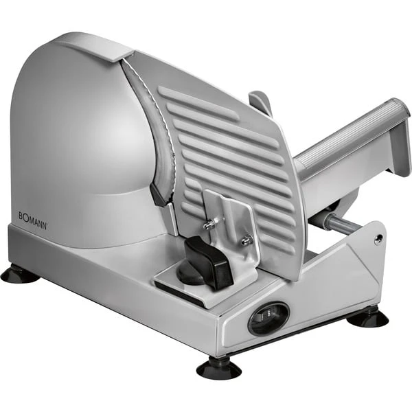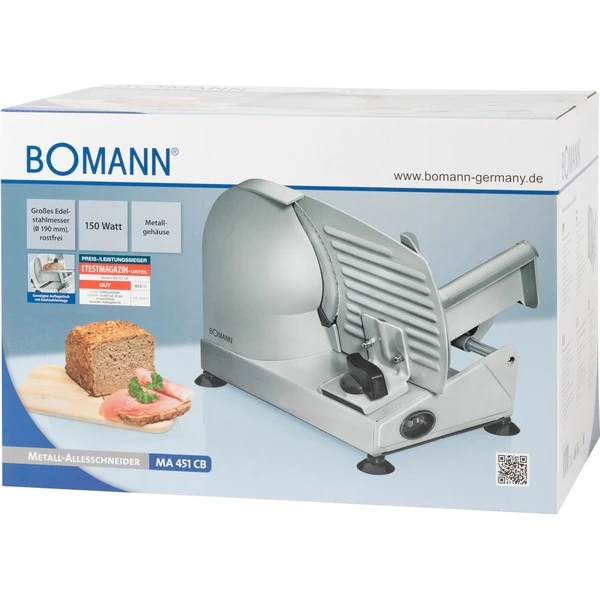 Der Metall-Allesschneider MA 451 CB von Bomann überzeugt durch die kompakte Bauweise und einer Spitzenschneidleistung von bis zu 150 Watt. Das Edelstahl-Wellenschliffmesser hat einen Durchmesser von 19cm und eignet sich ideal für Brot, Wurst oder Käse. Die Schnittstärke lässt sich dabei stufenlos von 0 bis zu 15mm einstellen. Der Allesschneider MA 451 CB ist mit einem Ein- und Ausschalter, einer Metallführungsschiene und einer Anstellplatte aus Metall ausgestattet. Der Restehalter mit Fingerschutz und die Gummisaugfüße sorgen für Sicherheit beim Schneiden.Art.-Nr.: 1460360