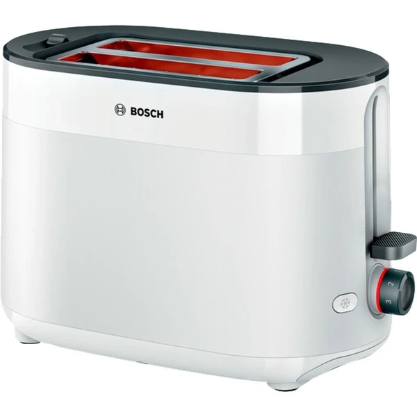 Der Kompakt-Toaster TAT2M121 aus der Serie MyMoment von Bosch bietet Platz für zwei Toastscheiben. Der Toaster mit praktischer einseitiger Bedienung, klappbarem Brötchenwärmer und ansprechendem Oberflächendesign mit matt-glänzenden Highlights bringt Leben und Farbe in die Küche. Mit dem stufenlos regelbaren elektronischen Röstgradwähler lässt sich der gewünschte Bräunungsgrad einstellen. Die automatische Brotzentrierung und die elektronische Bräunungsgradkontrolle sorgen für ein optimales und gleichbleibendes Röstbild. Die Auftau- und Aufwärmstufe taut nicht nur das Brot auf, sondern toastet es auch schön knusprig, als wäre es frisch vom Bäcker. Praktisch ist außerdem die High-Lift Funktion für die sichere Entnahme kleiner Brotscheiben, die beleuchtete Stopp-Taste sowie der integrierte und versenkbare Brötchen-Aufsatz. Da sich die leicht zugängliche Krümelschublade an der Vorderseite befindet, kann man sie zum Reinigen schnell herausnehmen. Die automatische Sicherheitsabschaltung, wenn sich der Toast verklemmt, macht die Bedienung des MyMoment TAT2M121 nicht nur einfach, sondern auch sicher.Art.-Nr.: 100028796