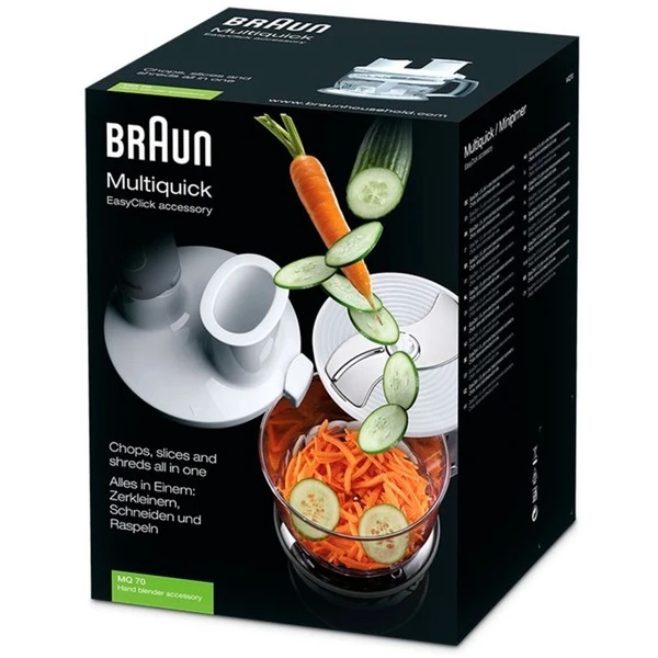 Der Braun MQ 70 Küchenmaschinenaufsatz ist eine unglaublich vielseitige Lösung für den MultiQuick 7 Stabmixer und erlaubt es, Lebensmittel zu zerkleiner, mixen, schneiden, reiben und noch vieles mehr. Dank EasyClick System kann der Aufsatz in wenigen Sekunden angeschlossen werden und verfügt über eine Reihe von Schneideelementen für sämtliche Aufgaben. Mit dem Aufsatz kann schwerer Teig für Brot, Kuchen, Pasta oder Pizzen wunderbar leicht geknetet werden – ganz wie von Hand. Art.-Nr.: 1493085