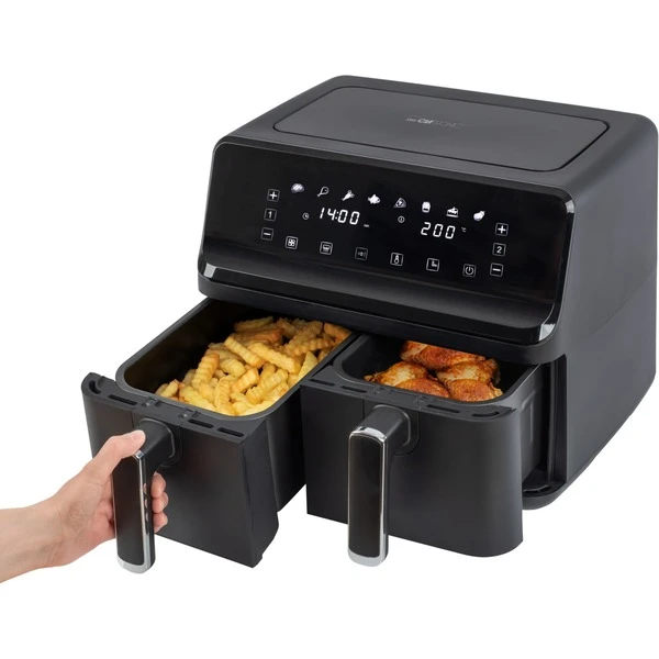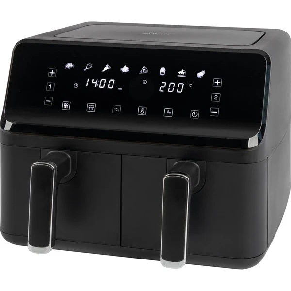 Die Doppel-Heißluftfritteuse FR 3804 H von Clatronic verwandelt das Kochen in ein aufregendes Abenteuer. Mit der großzügigen Kapazität von 8,0 Litern in zwei getrennten 4,0 Liter Behältern bietet sie genügend Platz für alle kreativen Ideen. Mit ihrer öl- und fettfreien Technologie ermöglicht sie, gesunde, kalorienarme Mahlzeiten zu zaubern, die genauso knusprig sind wie frittierte Köstlichkeiten. Die zwei separaten Frittier-Behälter mit jeweils eigener Steuerung ermöglichen es, verschiedene Gerichte zur gleichen Zeit zuzubereiten, ohne dass sich die Aromen vermischen. Mit den acht Automatikprogrammen (Kotelett, Geflügel, Garnelen, Fisch, Pizza, Pommes, Gebäck, Gemüse, Aufwärmen) und den individuellen Zeit- und Temperatureinstellungen kann man jedes Gericht nach den eigenen Wünschen anpassen. Das „Just In Time“ System sorgt dafür, dass die Mahlzeiten punktgenau serviert werden können, selbst wenn sie unterschiedliche Garzeiten erfordern. Dieses Programm startet den zweiten Korb erst, wenn die längere Garzeit die kürzere Garzeit erreicht hat. Die Doppel-Heißluftfritteuse FR 3804 H macht das Kochen nicht nur gesünder, sondern auch angenehmer, ohne lästige Rauch- und Geruchsentwicklung. Cool Touch-Griffe gewährleisten eine sichere Handhabung, und die beiden LED-Displays mit Sensor Touch-Tasten lassen sich mühelos bedienen. Die antihaftbeschichteten Behälter erleichtern das Reinigen und die beiden separat regelbaren Thermostate sowie der Überhitzungsschutz bieten sorgloses Kochen.Art.-Nr.: 100027170