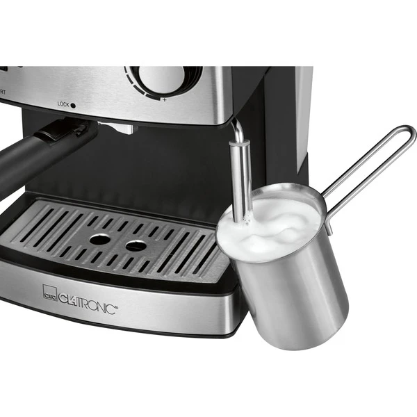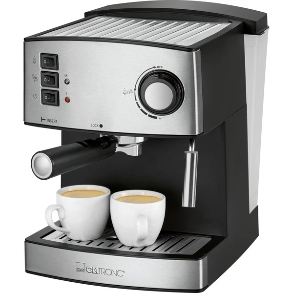 Die Clatronic ES 3643 Espressomaschine mit Siebträger ermöglicht leckeren Espresso-Genuss zu Hause. Der Druck von 15 Bar sorgt dabei für einen gleichmäßigen Brühvorgang. Die schwenkbare Edelstahldampfdüse mit Aufschäum- und Heißwasserfunktion zaubert bei Bedarf einen wundervollen Cappuccino oder Latte Macchiato. Die ES 3643 besitzt zudem eine Tassenvorwärmfunktion mit Edelstahleinlage, damit der Kaffee immer mit der richtigen Temperatur getrunken werden kann. Die Dampfdüsenspitze und der Auffangbehälter mit Edelstahl-Abtropfgitter sind außerdem abnehmbar, was die Reinigung besonders einfach macht.Art.-Nr.: 1460126
