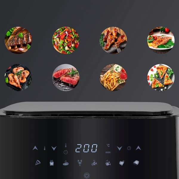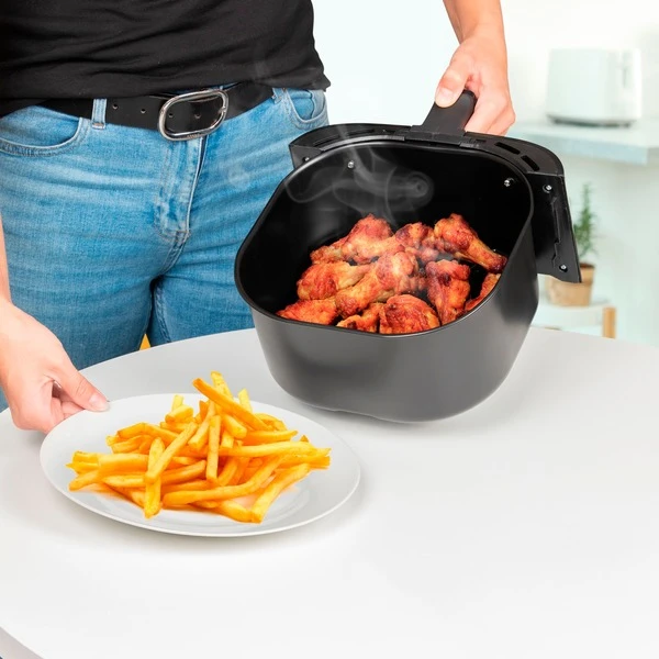 Mit der Heißluft-Fritteuse XXL FR 3782 H von Clatronic genießt man vollkommen öl- und fettfrei zubereitete Speisen wie Pommes, Chicken Nuggets oder Fisch. Dank extra großer 5 Liter Kapazität eignet sich die Heißluft-Fritteuse auch perfekt für die ganze Familie. Die Bedienung gestaltet sich dabei einfach: Auf dem beleuchtetem Sensor-Touch Display lassen sich komfortabel die Temperatur und Zeit individuell einstellen. Man kann aber auch eines der automatischen Programme auswählen. Es kann zwischen 8 Programmen gewählt werden: Pommes, Pizza, Steak, Hähnchen, Garnelen, Fisch Gemüse und Rippchen. Dank 360° Air-Flow Heißluftzirkulation wird die heiße Luft gleichmäßig überall im XXL-Garraum verteilt, sodass die Speisen gleichmäßig frittiert werden Der antihaftbeschichtete Behälter und Siebeinsatz sind zur leichten Reinigung herausnehmbar. Dank stufenlos einstellbarer Temperatur zwischen 80° – 200°C ist die Heißluft-Fritteuse individuell einstellbar. Der Cool Touch Griff bleibt immer kühl und kann somit jederzeit problemlos berührt werdenArt.-Nr.: 1900568