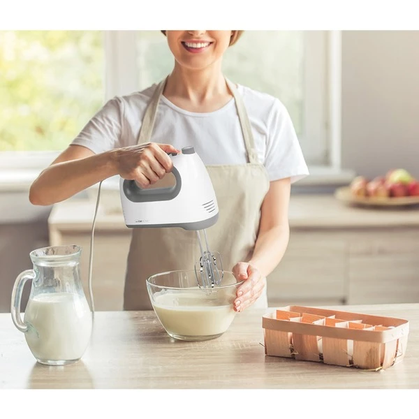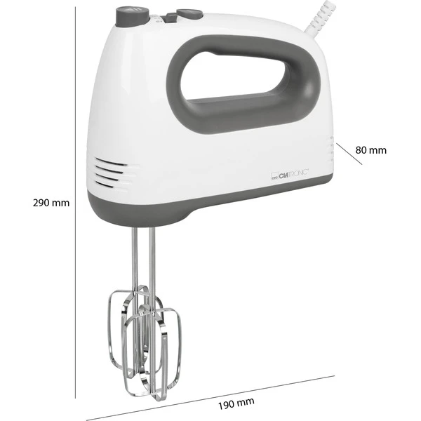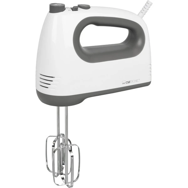 Der Handmixer HM 3775 von Clatronic überzeugt durch einen kraftvollen Motor mit 400 Watt Leistung und fünf Geschwindigkeitsstufen. Durch die verschiedenen Geschwindigkeitsstufen und die Turbo-Funktion für maximale Leistung lässt sich die gewünschte Rührgeschwindigkeit einstellen. Der Handmixer ist mit einer Auswurftaste für Rührbesen und Knethaken. Im Lieferumfang sind Edelstahlquirle und -knethaken enthalten, die für eine einfache Reinigung spülmaschinengeeignet sind.