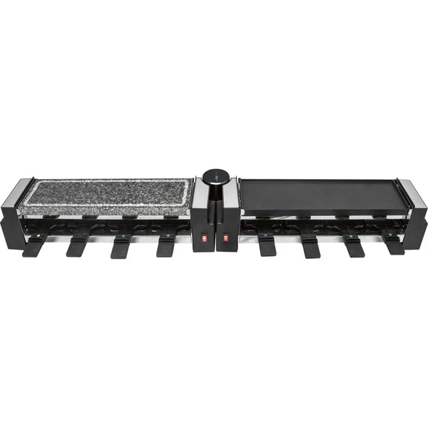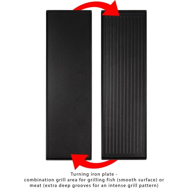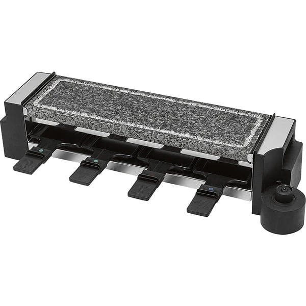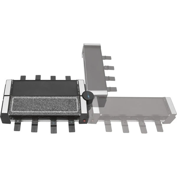 | Feature | Auch als 4 Personen-Raclette verwendbar. 180 °-Drehgelenk ermöglicht eine variable Position der beiden Grillflächen. | ||