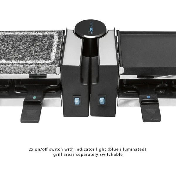 Raclette ist perfekt zum zusammensitzen und gemeinsam leckere Köstlichkeiten genießen. Ob an Weihnachten, Silvester, zum Geburtstag oder einfach so. Der RG 3678 verhilft zum gemütlichen Abend mit Familie und Freunden. Grillen und genießen, deftig oder gesund – mit dem eleganten und hochwertig verarbeiteten 2in1 Raclette-Grill von Clatronic ist das kein Problem. Das leistungsstarke Raclette besteht aus einem Naturgrillstein für gesundes und fettarmes Grillen von Gemüse und einer Wendegussplatte mit kombinierter Grillfläche zum Grillen von Fisch (glatte Oberfläche) oder Fleisch (extra tiefe Rillen für ein intensives Grillmuster). Das 180°-Drehgelenk ermöglicht eine variable Position der beiden Grillflächen. Egal ob 4 oder 8 Personen, ob langer Tisch oder runder, so findet das Raclette auf jedem Tisch seinen richtigen Platz. Zusätzlich ist das Gerät bei Benutzung für alle 8 Personen bequem erreichbar. Das RG 3678 ist dank zwei separater Ein-/Ausschalter mit Kontrollleuchte (blau beleuchtet) und der separat schaltbaren Grillflächen, auch als 4-Personen-Raclette verwendbar). Die Grillplatte und die Pfännchen sind antihaftbeschichtet. Dies ermöglicht eine leichte Reinigung nach jedem Gebrauch.Art.-Nr.: 1864166