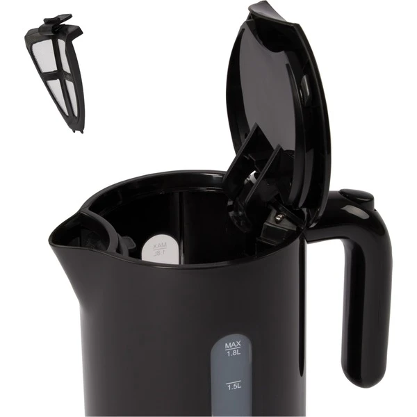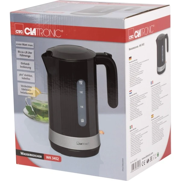 Mit einer Leistung von 2200 Watt bringt der WK 3452 von Clatronic das Wasser schnell und effizient zum Kochen, dabei liegt die maximale Füllmenge bei 1,8 Liter. Dank des Sicherheits-Klappdeckels kann der WK 3452 mit einer Hand geöffnet und befüllt werden. Dabei lässt sich die Füllmenge über die außenliegenden Anzeigen ablesen. Die Bedienung erfolgt über einen beleuchteten Ein-/Ausschalter. Zur besseren Reinigung kann der Kalkfilter entnommen werden und das Edelstahl-Heizelement ist verdeckt. Für Sicherheit sorgen der Überhitzungsschutz und die Abschaltautomatik.