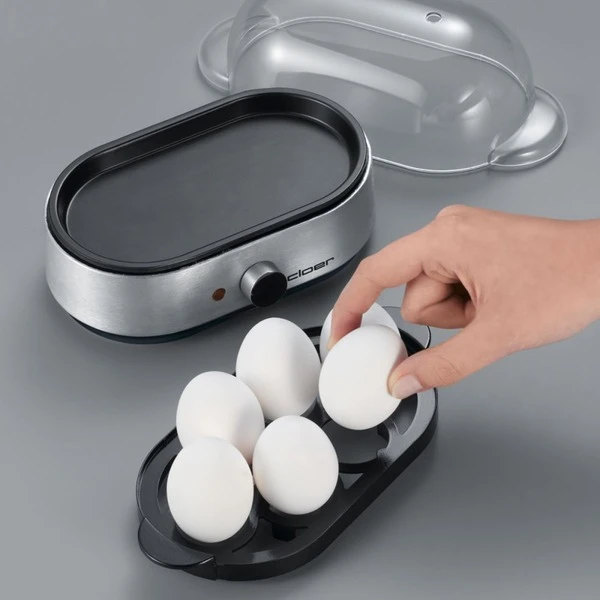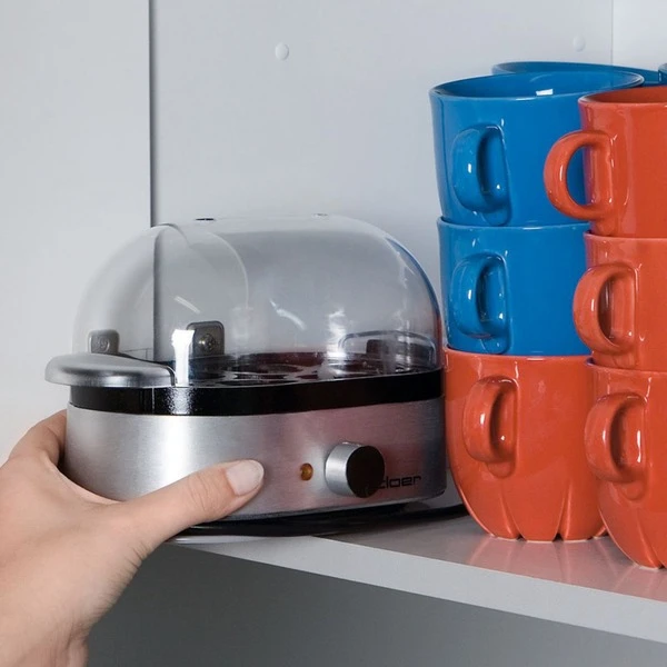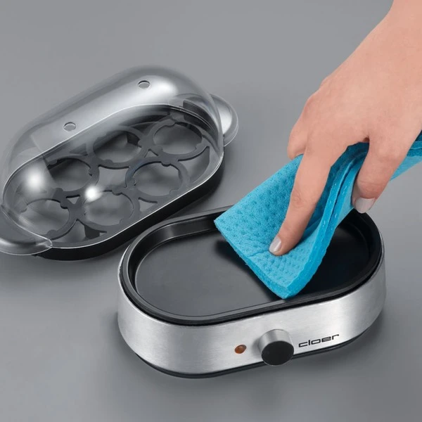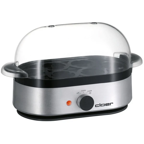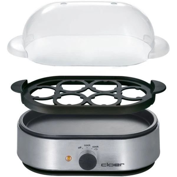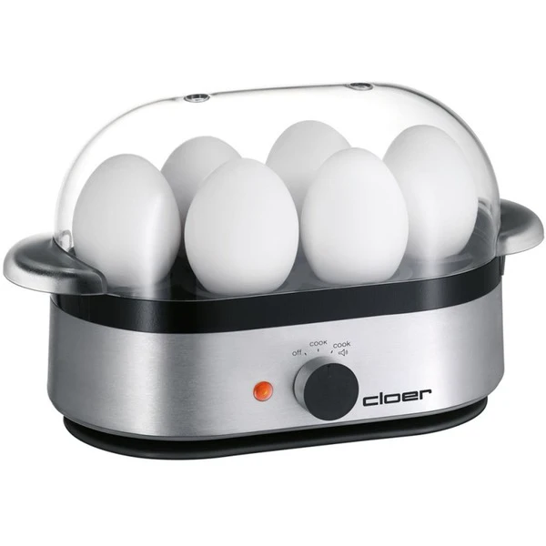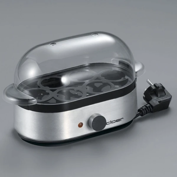 Nicht nur Kochen, auch Pochieren! Der praktische Eierkocher 6099 von Cloer kann bis zu sechs Eier auf einmal kochen, oder auch mit den mitgelieferten Einsätzen pochieren. Einfach mit dem beiliegenden Messbecher kaltes Wasser abmessen, die zu kochenden Eier in den Einsatz stellen und mit der durchsichtigen Haube abdecken. Wenn die Eier den gewünschten Härtegrad haben, ertönt ein akustisches Signal. Kein Warten mehr, ob das Wasser nicht endlich kocht und kein Vergessen der optimalen Kochzeit. Durch das Perforieren der Eierschale mit dem integrierten Eierstecher wird auch das morgendliche Debakel der geplatzten Eier vermieden. Besonders praktisch ist es, dass die transparente Haube, die Eierträger und Einsätze spülmaschinengeeignet sind.Art.-Nr.: 153742