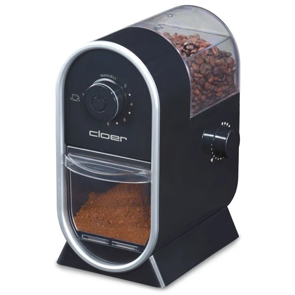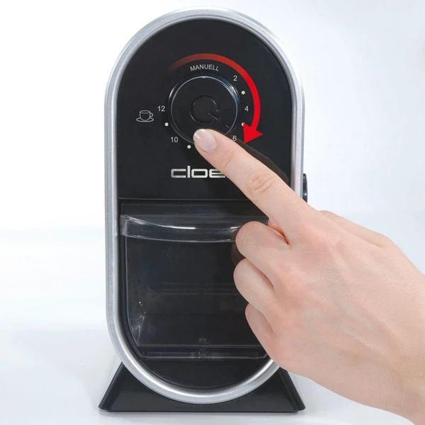 Die Cloer Kaffeemühle 7560 mit schwarzem Kunststoffgehäuse besitzt einen Mahlgradregler für grobes bis feines Kaffeepulver. Die Mahlmenge ist wählbar. Der herausnehmbarer Kaffeepulver-Behälter eignet sich für bis zu 150g Kaffeepulver. Die Sicherheitsverriegelung sorgt dafür, dass der Betrieb nur mit geschlossenem Deckel bzw. mit Kaffeepulver-Behälter möglich ist.
