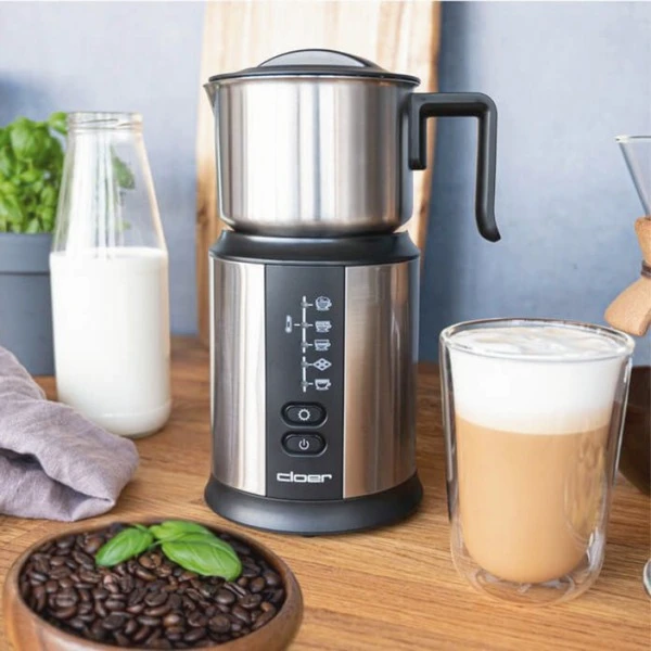 Der Milchaufschäumer 7789 von Cloer überzeugt mit 500 Watt Leistung. In dem abnehmbaren Metallbehälter mit Deckel lassen sich bis zu 250 ml Milch aufschäumen. Die Bedienung ist dank des Ein-/Ausschalters und der 5 unterschiedlichen Modi sehr einfach. Das Aufschäumen der Milch erfolgt mit einer magnetischen Spule und das ganz ohne Führungsstab oder Führungsachse in dem Edelstahlkännchen. Die Spule wird wie von unsichtbarer Hand zentriert und angetrieben. Wird der fertige Milchschaum ausgegossen, fällt die Spule nicht in die Tasse, sondern haftet seitlich an dem Kännchen. Die Reinigung ist aufgrund nicht notwendiger Führungselemente sehr leicht. Milchkännchen, Spule und falls notwendig der Deckel können unter fließendem Wasser oder in der Spülmaschine gereinigt werden.