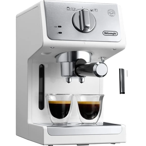 Die DeLonghi Active Line ECP 33.21.W ist eine Espressomaschine für Kaffeepulver und Easy Serving Espresso (E.S.E.)-Pads. Einfach die Lieblings-Geschmacksrichtung oder das Lieblings-Pad wählen und einen ergiebigen, milden Espresso mit einer perfekten Crema zubereiten. Der professionelle Siebträgerhalter sorgt für eine konstante Kaffeetemperatur während der Zubereitung bis in die Tasse. Der Druck von 15 bar sorgt für einen Espresso mit vollem Aroma und einer nussfarbenen Crema oben drauf. Mit der Kombination aus professioneller Milchaufschäumdüse und herausnehmbarer Auffangvorrichtung können Cappuccino, Latte Macchiato und andere Milch-Kaffeespezialitäten auch zu Hause stilecht in hohen Gläsern zubereitet werden. Die zusätzlichen Filtereinsätze (für 1 oder 2 Tassen und E.S.E. Pads) und der Tamper können ordentlich im Gerät verstaut werden. Die Espressomaschine schaltet sich automatisch 9 Minuten nach der letzten Benutzung aus. Das spart Energie und schont die Umwelt.Art.-Nr.: 1628163