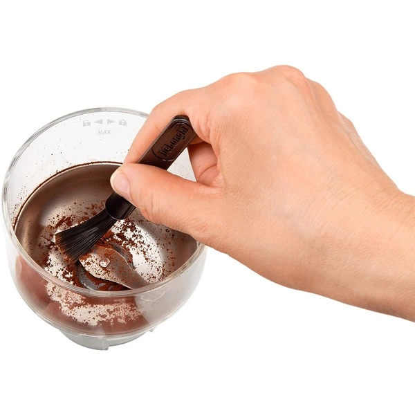 Die DeLonghi KG210 ist eine elektrische Kaffeemühle mit Klingenmahlwerk, die mühelos Bohnen zu Pulver zerkleinert. Dank der Edelstahlklingen ist der Mahlmechanismus sehr langlebig und robust. Der transparente Bohnenbehälter fasst bis zu 90 Gramm und man mahlt einfach nur so viel Kaffee wie benötigt wird. Der Mahlvorgang wird über Druck auf den Deckel gestartet. Wird die Taste gedrückt leuchtet ein Lämpchen für fein, mittel oder grob auf. So können die Bohnen ganz einfach nach den individuellen Bedürfnissen gemahlen werden. Der Behälter der KG210 Kaffeemühle ist leicht entnehmbar und kann nach Benutzung mit der beiliegenden Bürste gereinigt werden. Art.-Nr.: 1628075