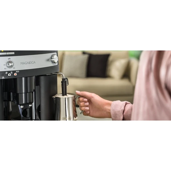 Die Magnifica ESAM 3000.B von DeLonghi ist ein Kaffee-Vollautomat der Extraklasse. Nach dem Anschalten braucht die Maschine ca. eine Minute zum Erhitzen, dann gibts auch gleich schon den ersten Kaffee. Der Automat ist sehr leicht zu bedienen, der Wassertank kann ganz einfach nach vorne entnommen und gefüllt werden. Der Bohnenbehälter befindet sich oben drauf, genauso wie auch der Kaffeepulver-Behälter. Der Mahlgrad sowie die Kaffeemenge und die Stärke können einfach eingestellt werden. Es gibt eine Düse extra zum Aufschäumen für einen Milchkaffee. Die Magnifica ESAM 3000.B hat auch eine Einstellung für Tassengrößen wie z. B. Ristretto, Espresso und Lungo. Sobald eine Entkalkung nötig ist, wird es angezeigt und man kann mit wenigen Handgriffen ein Entkalkungsprogramm abspielen lassen, dass ca. eine halbe Stunde dauert.Art.-Nr.: 788610