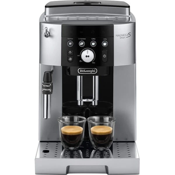 Die Magnifica S Smart ECAM 250.23.SB von DeLonghi ist ein Kaffeevollautomat der Extraklasse. Nach dem Einschalten benötigt die Maschine ca. eine Minute zum Erhitzen, anschließend kann man sich auch gleich schon den ersten Kaffee zubereiten. Der Automat ist sehr leicht zu bedienen, der Wassertank kann ganz einfach nach vorne entnommen und befüllt werden. Der Bohnenbehälter mit Aromaschutzdeckel befindet sich oben, genauso wie auch der Kaffeepulverschacht. Der Mahlgrad sowie die Kaffeemenge und -stärke können einfach eingestellt werden. Die integrierte Milchaufschäumdüse ermöglicht zudem die Zubereitung von traditionellem Milchschaum oder heißer Milch für zusätzlichen Kaffeegenuss. Sobald eine Entkalkung nötig ist, wird es angezeigt und man kann mit wenigen Handgriffen ein Entkalkungsprogramm abspielen lassen, das nach ca. einer halben Stunde abgeschlossen ist.Art.-Nr.: 1691154