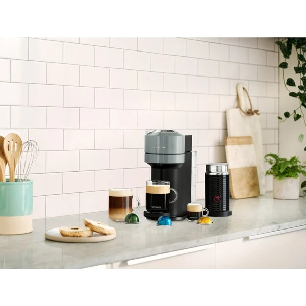Nespresso präsentiert das Kapselsystem Vertuo von DeLonghi, die designstarke Innovation für Kaffeegenießer. Das System überrascht mit einer großen Tasse Kaffee mit einer außergewöhnlich reichhaltigen Crema und vollem Körper. Dank der innovativen Centrifusion Technologie wird jeder Tropfen Kaffee sanft und gleichmäßig extrahiert. Durch die Barcode-Erkennung bereitet die Maschine automatisch für jede Röstmischung die optimale Tasse Kaffee in Größe und Qualität zu. Dabei werden verschiedene Parameter wie Wassermenge, Temperatur, Brühzeit und Rotationsgeschwindigkeit perfekt auf die Kaffeemischung abgestimmt. Mit nur einem einfachen Tastendruck wird ein umfassendes Angebot an unterschiedlichen Kaffeevarietäten in drei Kapselgrößen für jeden Geschmack und in verschiedenen Tassengrößen zubereitet. Die Vertuo Next zeichnet sich durch eine kompakte Stellfläche aus und verfügt außerdem über Bluetooth/Wi-Fi zur Verbindung mit der Nespresso App. Mit ihr erhält man z.B. Softwareupdates für die Maschine.Art.-Nr.: 1677224