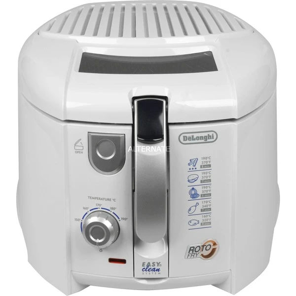 Die DeLonghi Roto-Fritteuse F 28311 kann bis zu 1 kg Fritiergut aufnehmen und überzeugt mit einer Leistung von 1800 Watt. Der rotierende Fritierkorb sorgt für gleichmässiges Frittieren und benötigt somit nur 50 % an Öl-Menge. Über einen regelbaren Thermostat lassen lässt sich die gewünschte Temperatur einstellen und durch das Panorama-Sichtfenster das Frittiergut beobachten. Praktisch bei der Roto-Fritteuse F 28311 sind die beiden auswechselbaren Geruchs- und Fettdunstfilter.Art.-Nr.: 856758