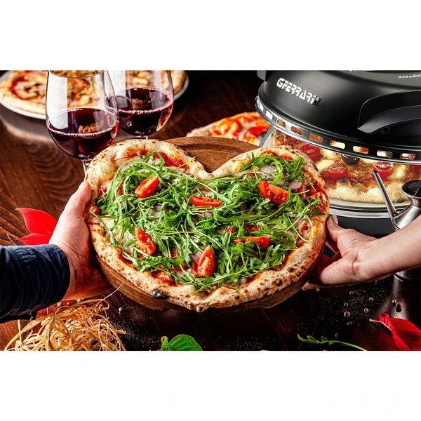 Mit dem elektrischen Pizzamaker Delizia von G3 Ferrari gelingen Pizzen zu Hause so einzigartig und knusprig wie aus dem Steinbackofen beim Italiener. Der G3 Ferrari Pizzaofen erreicht Temperaturen von bis zu 400 Grad, für perfekte Backergebnisse. Er eignet sich auch zum schnellen Aufwärmen und Aufbacken von frisch duftendem Brot, Croissants und Baguette. Blitzschnell in nur ca. 5 Minuten ist selbstgemachte Pizza servierbereit, Tiefkühlpizza in ca. 3 Minuten. Durch das Backen mit dem feuerfesten, lebensmittelechten Naturstein wird die Feuchtigkeit des Teiges absorbiert und die Hitze im Stein gespeichert und gleichmäßig an den Teig abgegeben. Das Ergebnis ist ein besonders gleichmäßig knuspriger Boden, lecker und kross. Der Pizzaofen Delizia bietet vielfältige Möglichkeiten, morgens, mittags und abends: Leckere warme Brötchen oder Toast am Morgen, frische Burritos oder Wraps zu Mittag, krosse neapolitanische Pizza, Fladen, Lahmacun oder Flammkuchen zum Feierabend. Dabei ist der Pizzaofen praktisch, einfach in der Bedienung und so kompakt, dass er einfach mitgenommen werden kann, zum Geburtstag, Filmevent, Fußballspiel, Mädelsabend, Camping, nettes Zusammensein oder als Geschenkidee. Durch das ansprechende Design und die vielen erhältlichen Farben ist der Pizzaofen ein Blickfang für jede Küche.Art.-Nr.: 1587680