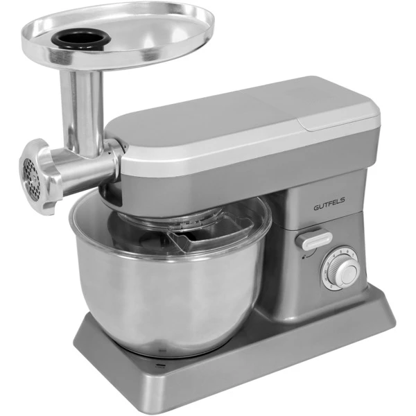 Mit der silbernen Küchenmaschine KM 8101 SI von Gutfels können die verschiedensten Lebensmittel zubereitet werden. Zur Ausstattung gehören ein Fleischwolf, ein Mixbehälter aus Glas, Schneebesen und Rührhaken. Mit dem 1.200 Watt Motor, den 10 Geschwindigkeiten mit Turbofunktion und der Plusfunktion wird zerkleinert, gerührt und gemixt. Während des Betriebes ist dank des transparenten Deckels für Spritzschutz gesorgt und man hat die Lebensmittel gut im Blick. Die Edelstahl-Rührschüssel hat ein Fassungsvermögen von 6,2 Liter, der beiliegende Mixbehälter ein Fassungsvermögen von 1,5 Liter. Die rutschfesten Standfüße sorgen auch bei hohen Geschwindigkeiten für einen sicheren Stand.Art.-Nr.: 1796420