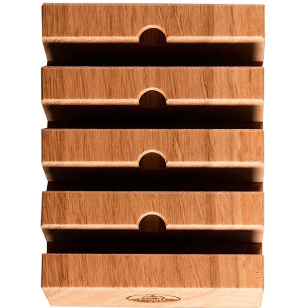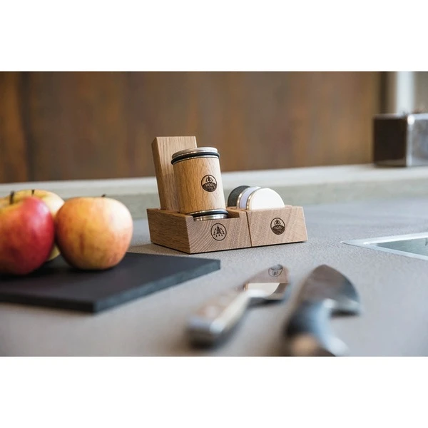 Die Schleifscheiben Station von HORL ist eine Aufbewahrungsstation für max. vier HORL Rollschleifer-Schleifscheiben. Sie wird aus einem massiven Block Eichenholz im Schwarzwald gefertigt. Die feinen Fasen veredeln die exklusive Optik. So sind die benötigten Schleifscheiben immer griffbereit und ein Blickfang in jeder Küche.Art.-Nr.: 1621774