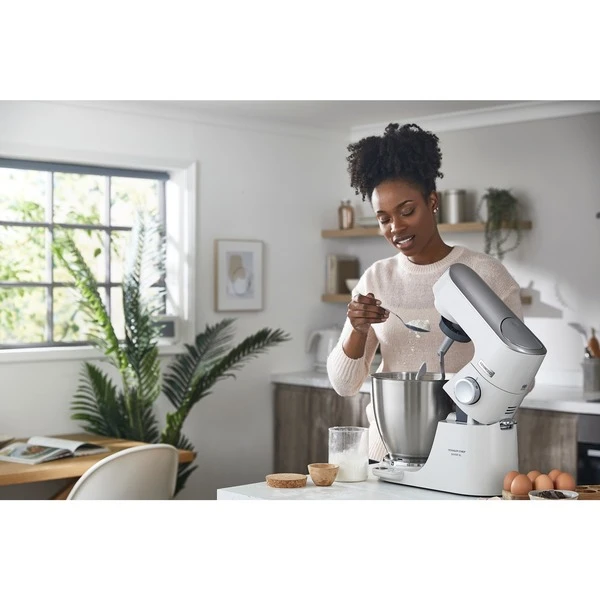 Die Kennwood Chef Titanium Baker Küchenmaschine in weiß kombiniert die bewährte Zuverlässigkeit des Chef-Motors mit einem frischen, ikonischen Design. Mit der integrierten EasyWeigh-Waage kann man die Zutaten direkt in der Rührschüssel abwiegen. Mit dem starken 1.200 Watt Motor und der stufenlosen Geschwindigkeitskontrolle hat man den Rührprozess immer unter Kontrolle. Dank Unterheb-Funktion und Soft-Start kannst du Zutaten behutsam und langsam verrühren, ganz ohne Spritzer. Das einzigartige planetarische Rührsystem nimmt alle Zutaten vom Rand und Boden der Rührschüssel auf und verrührt sie sanft und geschmeidig miteinander. Der Timer zählt bis zu 30 Minuten hoch und pausiert (bis zu 30