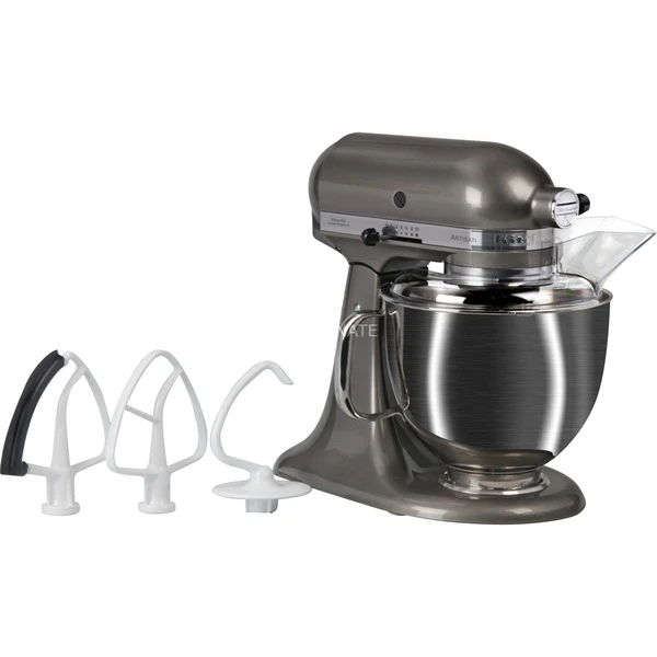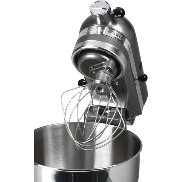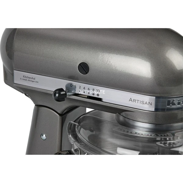 Die bekannte, einzigartige und vielseitige KitchenAid Küchenmaschine 5KSM175PSEMS in MedaillionSilver sorgt dank ausgefeilter Funktionen, robuster Metallkonstruktion und einer Ansatznabe zum Anbringen zahlreicher Zubehörteile für professionelle Ergebnisse. Das Original-Planetenrührwerk, bei dem der Rührbesen in eine Richtung rotiert, während er in die andere Richtung quirlt und dreht, holt die Zutaten immer wieder in die Mitte der Schüssel zurück. 10 Geschwindigkeitsstufen sorgen für schnelles, gründliches und exaktes Mixen. In der großen 4,8-Liter-Edelstahlschüssel kann man kleine und große Mengen verarbeiten. Die kleine 3-Liter-Schüssel ist nützlich zum Zubereiten kleinerer Mengen und macht das Abwaschen zwischen den einzelnen Zubereitungsschritten überflüssig. Für die unterschiedlichsten kulinarischen Ansprüche ist ein umfangreiches Sortiment an Standardzubehör enthalten, die einfach über die Ansatznabe angebracht werden. Die praktische Zubehörnabe ermöglicht mit weiterem, optional erhältlichen Zubehör auch das Hacken von Fleisch, das Schneiden von Gemüse, das Walzen und Schneiden von selbstgemachter Pasta, und viele weitere Zubereitungsmethoden. Dabei ist die Küchenmaschine 5KSM175PSEMS schnell und einfach zu bedienen.Art.-Nr.: 1311064