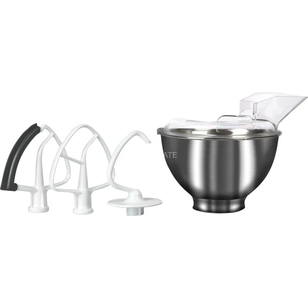 | Zubehör | vorhanden | 2 Edelstahlschüsseln (4,8l und 3l), Spritzschutz mit Einfüllschütte, Schneebesen, Flachrührer, Knethaken | |