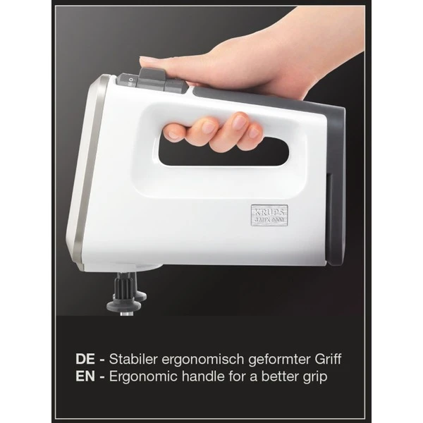 Der Handmixer Krups 3 Mix 9000 GN 9001 mit seiner hochwertigen Front aus gebürstetem Edelstahl eignet sich mit 500 Watt und einer stufenlosen Geschwindigkeitsregulierung optimal zum Verarbeiten von Teig oder zur Vorbereitung von Speisen. Der 3 Mix 9000 GN 9001 verfügt über ein optimales 3-Mix-Zubehör, bestehend aus zwei Turbo-Quirlen und zwei Spiral-Knetern, welche sich über die Auswurftaste bequem entfernen und darüber hinaus sogar in der Spülmaschine reinigen lassen. Die spezielle Form der Quirle sorgt für ein sekundenschnelles Ergebnis beim Eiweiß- oder Sahneaufschlagen. Die große Auflagefläche am Heck des 3 Mix 9000 GN 9001 sorgt für einen sicheren Stand des Geräts.Art.-Nr.: 1114941