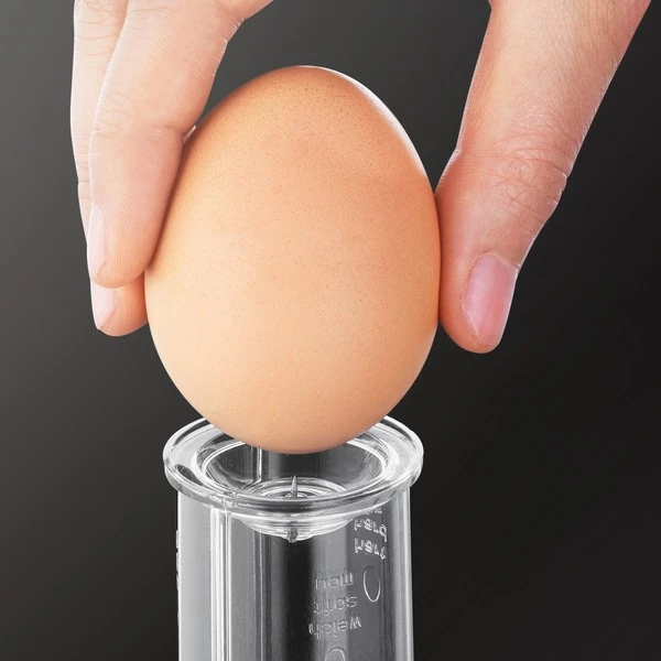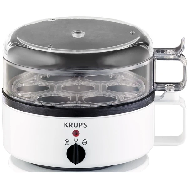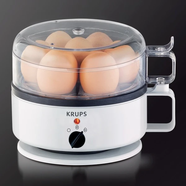 Mit dem praktischen Eierkocher Krups Ovomat Special F 230 70 können bis zu sieben Eier auf einmal gekocht werden. Einfach mit dem beiliegenden Meßbecher kaltes Wasser abmessen, Eier in den Einsatz stellen und abdecken. Wenn das Wasser vollständig verdampft ist ertönt ein akustisches Signal. Durch das Perforieren der Eierschale mit dem integrierten Ei-Pick an der Unterseite des Wasserdosierers vermeidet man geplatzte Eier.Art.-Nr.: 943590