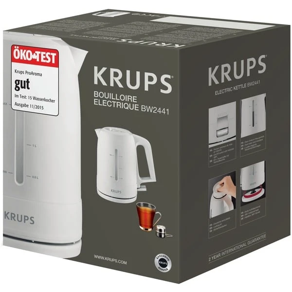 Der Wasserkocher Krups ProAroma BW 2441 kann bis zu 1,6 Liter Wasser aufnehmen und mit einer Leistung von 2400 Watt in kürzester Zeit erhitzen. Praktisch ist der herausnehmbarer Anti-Kalkfilter und dank des 360 Grad-Anschluss-Sockels kann der ProAroma BW 2448 in jeder Postion aufgestellt und in Betrieb genommen werden. Der ProAroma BW 2441 ist durch einen Sicherheitsdeckel, eine Kochstoppautomatik sowie einen Überhitzungs- und Trockengehschutz gesichert.Art.-Nr.: 1306193