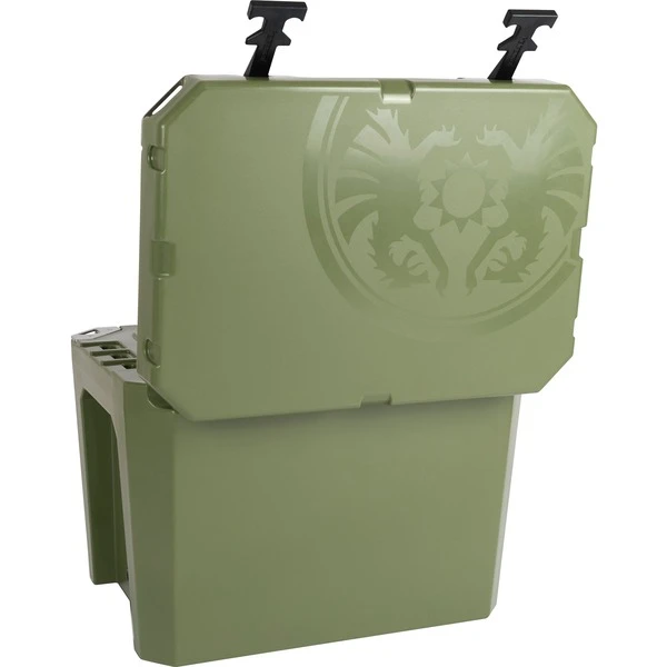 | Feature | Deckel mit rutschfester Oberfläche als Sitz- und erhöhte Standfläche, Deckelführungen für Zurrgurte bei geschlossenem Transport, verstärkte Verschlussplatten für zusätzliche Sicherung mit Bügelschloss, rutschfeste Gummiverschlüsse (einhändig bedienbar), ergonomische Tragegriffe und zusätzliche Verzurrpunkte zum sicheren Öffnen / Schließen während des Transports, rutschfeste Gummifüße für festen Stand und Luftzirkulation an der Unterseite | ||
