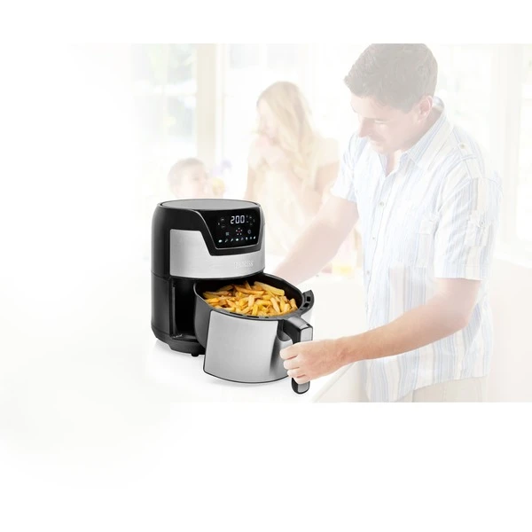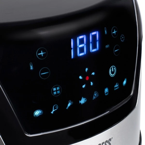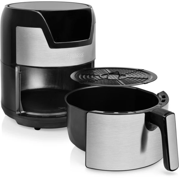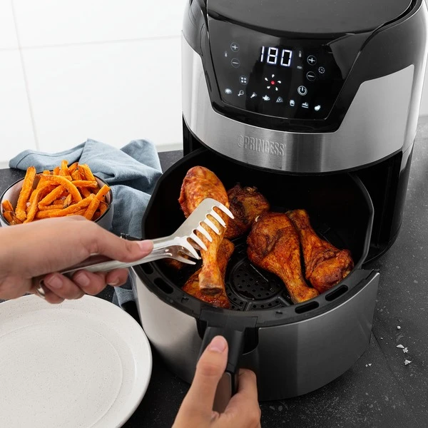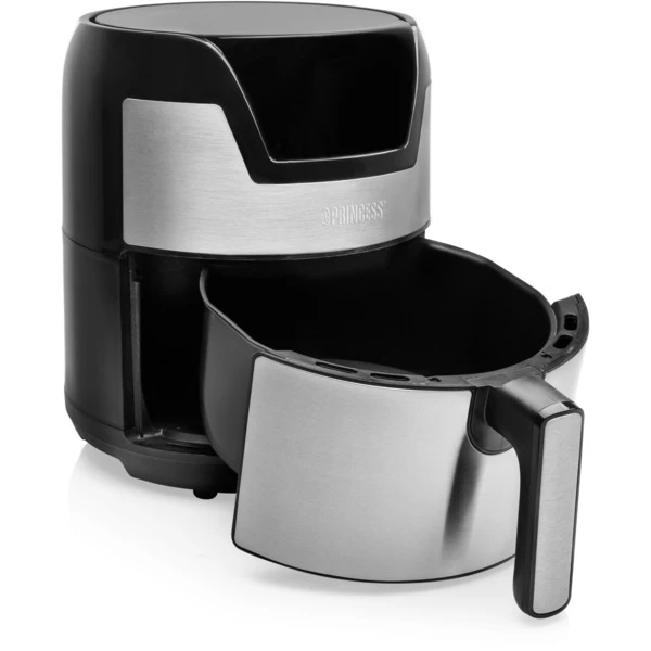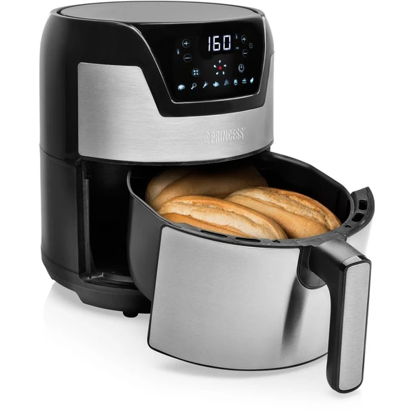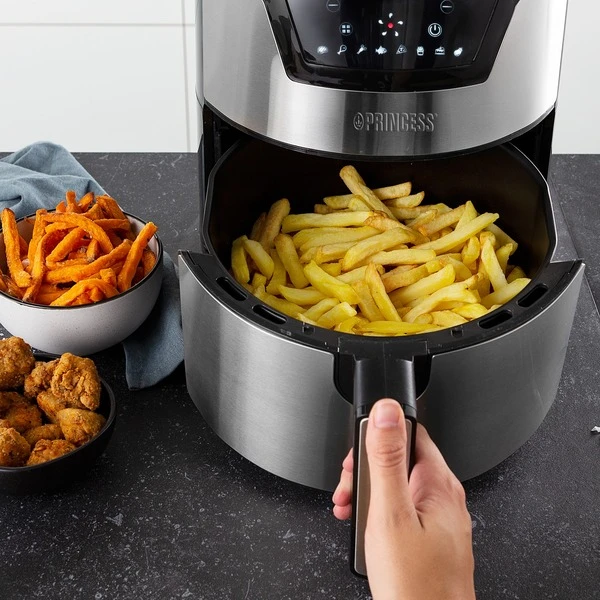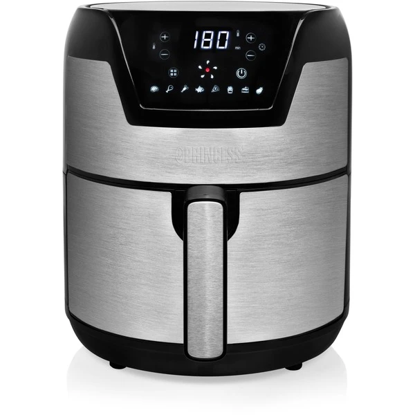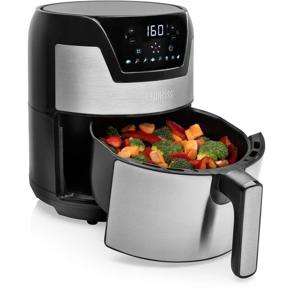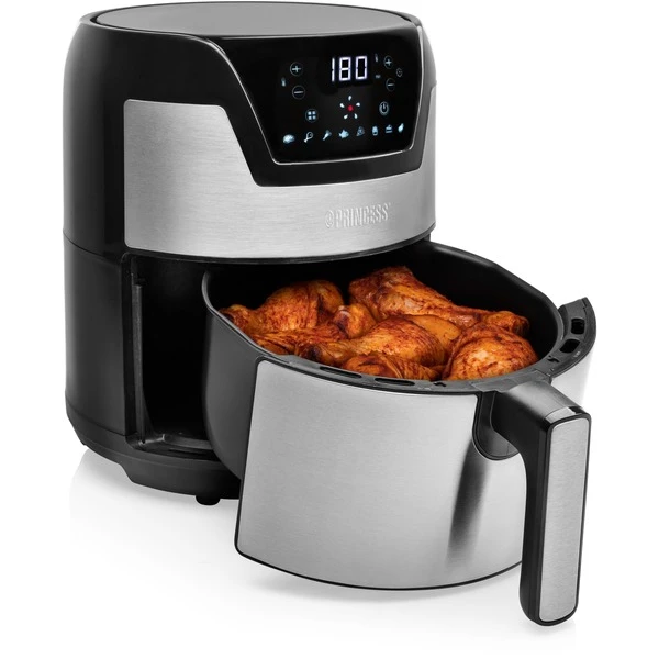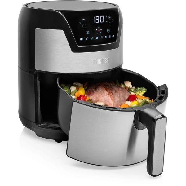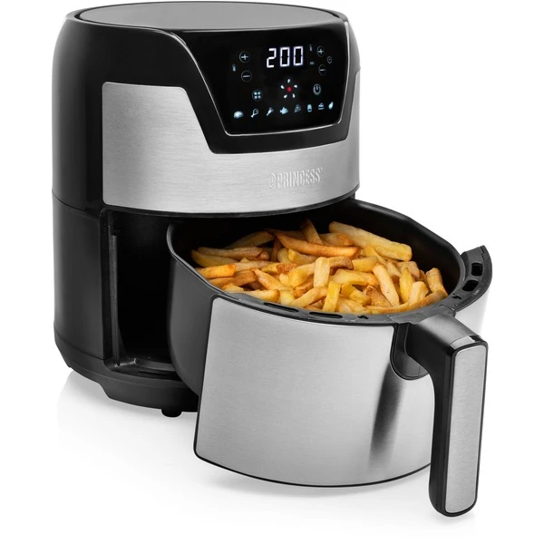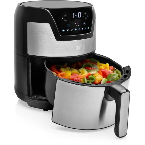 Mit dem Princess 182026 Digital Aerofryer XXL mit 4,5 Liter Fassungsvermögen lassen sich knusprige Pommes Frites oder ein komplettes Gericht für die ganze Familie auf einmal servieren. Dank der einzigartigen Kombination aus warmer zirkulierender Luft und der bequem einstellbaren Temperatur ist die Zubereitung im Princess Digital Aerofryer XXL gesund und fettarm. Mit dieser Heißluftfritteuse kann gebraten, gebacken, gegrillt und geröstet werden. Das LCD Display mit Touch-Bedienfeld und die vorprogrammierten Einstellungen machen das Frittieren zum Kinderspiel. Der Aerofryer bietet acht programmierte Einstellungen, die für Pommes Frites, Fleisch, Fisch, Garnelen, Geflügel, Steak und Kuchen ausgewählt werden können. Über das bedienungsfreundliche Display mit integriertem Timer lassen sich auch ganz bequem eigene Temperaturen und Garzeiten einstellen. So können herrliche Fleischbällchen, Brötchen und Quiches zubereitet werden. Mit dem abnehmbaren Korb und dem wärmeisolierten Griff ist das Servieren der Zutaten einfach und sicher. Der abnehmbare Korb und die antihaftbeschichtete Schublade des Princess Digital Aerofryer sind spülmaschinenfest, so dass das Gerät im Handumdrehen gereinigt ist. Dank Anti-Rutsch-Füßen hat die Heißluftfritteuse auf fast jeder Fläche einen sicheren Stand und kann weder kippen noch verrutschen. Eine weitere Sicherheitsmaßnahme ist der Überhitzungsschutz, der dafür sorgt, dass die Heißluftfritteuse nicht zu heiß wird. Die perfekte Heißluftfritteuse für solch hektische Abende, an denen man noch eine gesundes Gericht für sich und die Familie zubereiten möchte. Durch ihre Vielseitigkeit wird der Digital Aerofryer XXL rasch zum neuen Lieblingsküchengerät.Art.-Nr.: 1672877