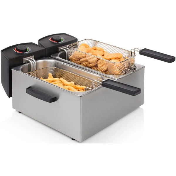 Mit der leistungsstarken Princess 183123 Doppel-Fritteuse kann man die zweifache Menge an Fisch und Pommes Frites für die Familie gleichzeitig garen. Dank einer Leistung von 2 x 1800 Watt wird die Fritteuse sehr schnell heiß. Ab sofort braucht man sich dank der Kaltzone und des innovativen Schutzfilters, der das Verspritzen von Fett und ein Übergaren verhindert, keine Sorgen mehr über verbrannte Stücke zu machen. Die Filter können auch benutzt werden, um das Fett zu filtern und viel länger sauber zu halten. Beide Frittierbehälter haben zwar einen gemeinsamen Stecker, können aber getrennt benutzt werden. Viele Fritteusen haben das Problem, dass kleine Krümel durch den Korb fallen und verbrennen, wenn das Fett mehr als einmal verwendet wird. Die Princess Doppel-Fritteuse verfügt über eine besondere Kaltzone, die das verhindert. Kleine Partikel werden in der Kaltzone unterhalb des Heizelements aufgefangen und verbrennen daher nicht. Mit dem Fettschutzfilter können all diese Partikel herausgefiltert werden. Das Fett bleibt dadurch erheblich länger sauber und es bilden sich keine schwarzen, ungesunde Rückstände auf den Pommes Frites. Der innovative Schutzfilter der Princess Fritteuse verteilt die Wassertropfen, die beim Frittieren von Tiefgefrorenem entstehen, so dass es weniger Spritzer gibt. Das Frittieren wird dadurch sicherer, und die Arbeitsplatte bleibt von Fettspritzern verschont. Die Princess Fritteuse hat einen Hauptstecker, so dass man für den Betrieb nur eine Steckdose braucht. Die beiden Heizelemente sind miteinander verbunden und lassen sich leicht abnehmen. Außerdem hat die Fritteuse zwei separate Thermostate, so dass jeder Behälter einzeln geregelt werden kann und Pommes Frites, Fisch oder Snacks gleichzeitig bei jeweils idealer Temperatur zubereitet werden können. Die Fettbehälter der Princess Fritteuse können einfach herausgenommen werden, zum Beispiel zum Austauschen des Fetts oder zum Reinigen der Behälter. Alle Teile der Fritteuse sind abnehmbar und überwiegend spülmaschinenfest. Die Griffe am Frittierkorb können außerdem eingeklappt werden. Auf diese Weise lässt sich das Gerät leicht reinigen und verstauen.Art.-Nr.: 1466802